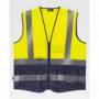 Chaleco combinado con cintas reflectantes. Parte superior de alta visibilidad. Escote a pico y cierre de cremallera. Un bolso de fuelle con cartera de velcro en el pecho y trabilla con argolla de plástico. Un bolso de pecho transparente para identificador personal. Dos bolsos laterales con fuelle y cierre de velcro. Una cinta reflectante en hombros y dos en pecho y espalda. Ribeteado con bies a contraste.