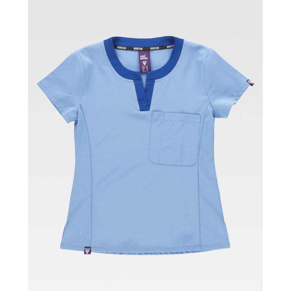 Casaca de señora combinada, de manga corta con tejido elástico. Cuello redondo combinado con abertura en V. Un bolsillo en pecho de plastón. Bolsillos para bolígrafos. Aberturas en los costados.
